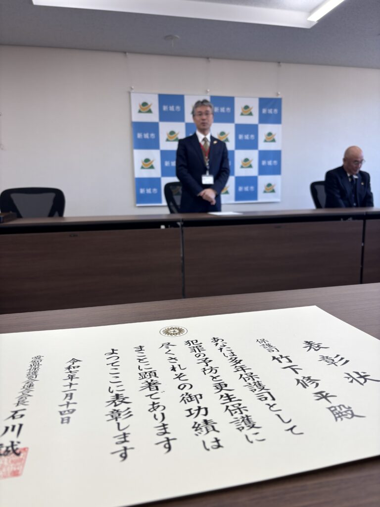 長年の保護司としての活動を労う表彰を受け止め、引き続き尽力してまいりたいと思います。