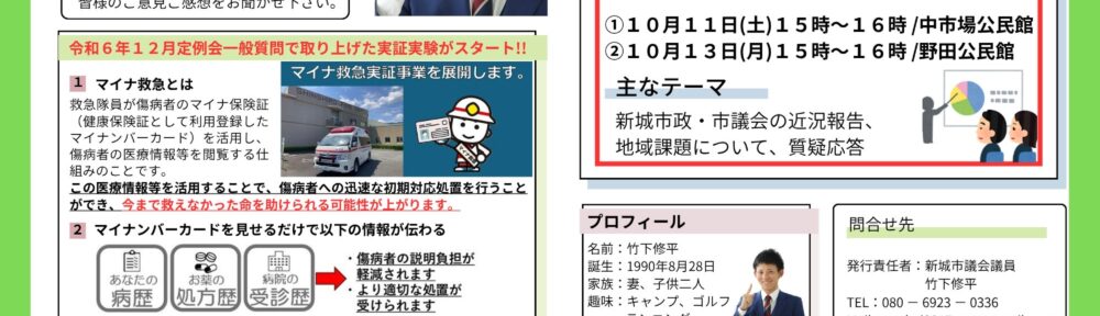 【野田公民館】10/13市政報告会開催! 投稿日時: 2025年10月12日 投稿者: Shuhei Takeshita こんばんは。 明日、10/13は先日の中市場公民館に続いて、野田公民館にて市政報告会を開催します。 お時間合う方はぜひこの機会に足をお運びください! それでは、また明日!