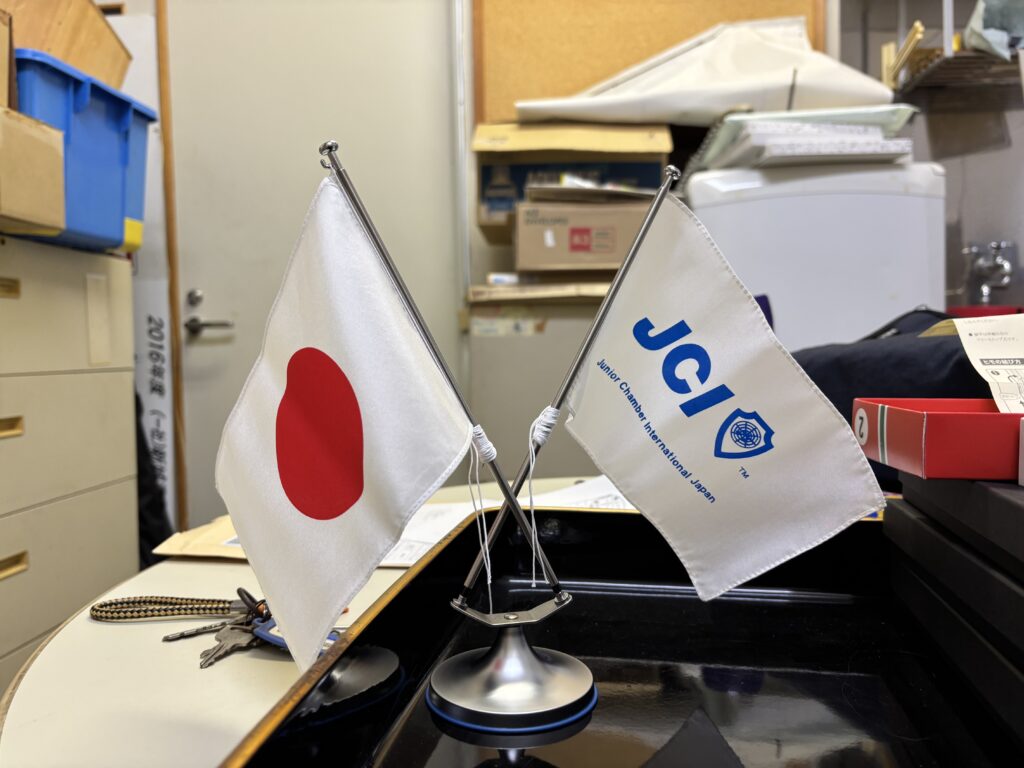 新城JCでは、卒業する際に現役メンバーの皆さんに記念品をお渡しする慣例があり、今回の卒業では手乗りサイズのミニ旗をいただきました。