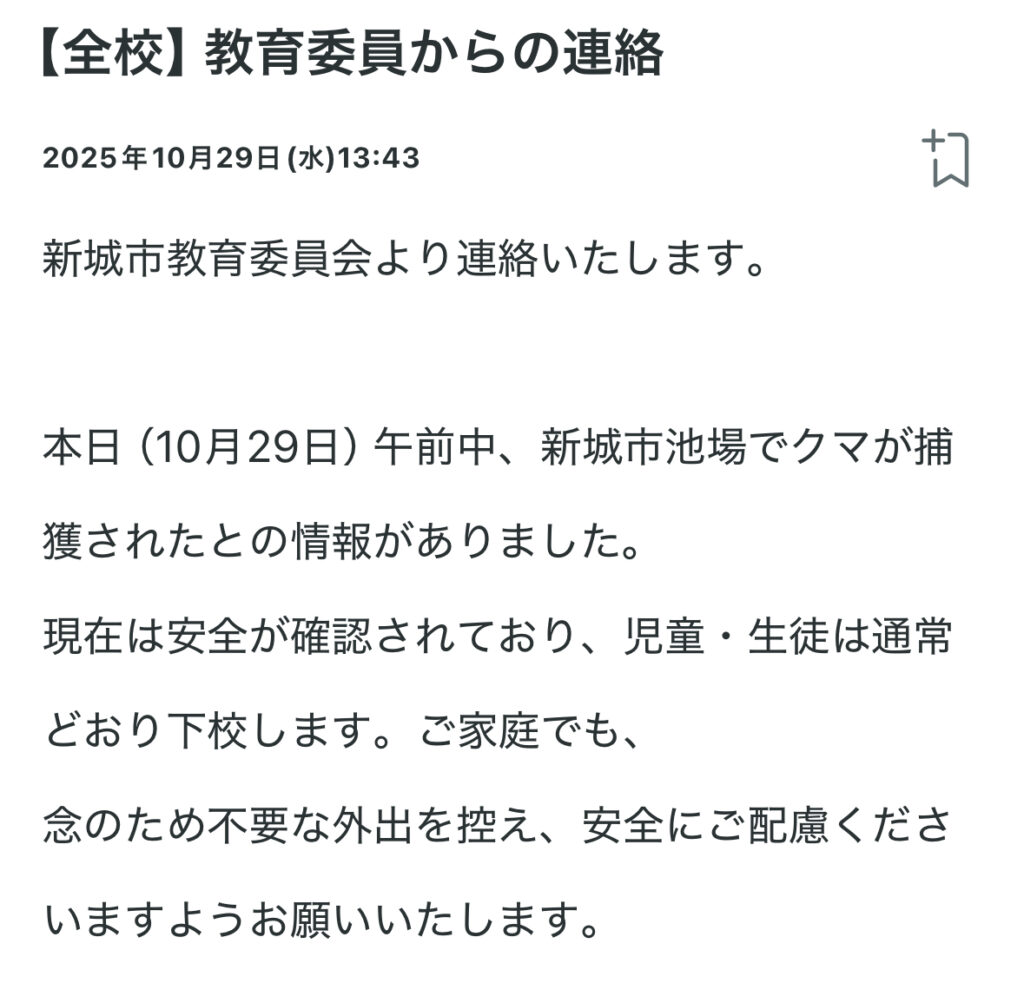 新城市内にて、本日午前中にクマが捕獲されたとの情報がございました。