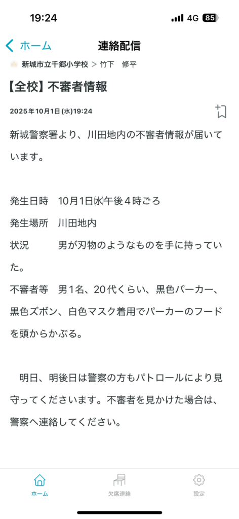 昨日夕方、新城市川田地内で不審者の目撃情報があったそうです。