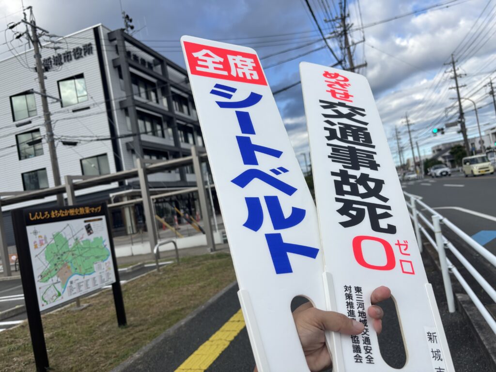 今朝は新城市役所東庁舎前にて、議員18人で秋の交通安全運動を行いました。
